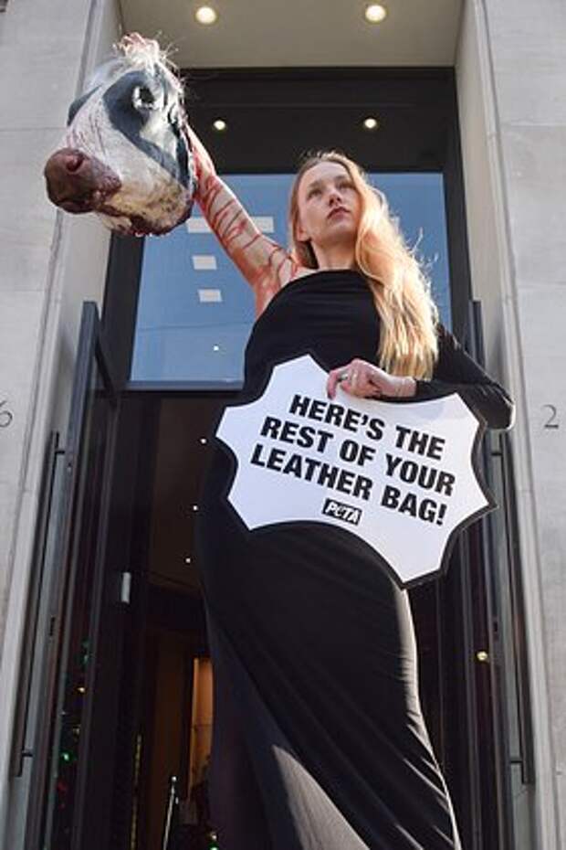 Осенью, в разгар модного сезона в Париже, у входа на показ бренда Coach появилась активистка-зоозащитница. В руках она держала муляж окровавленной головы коровы и транспарант с надписью: «Вот остальная часть вашей сумки».