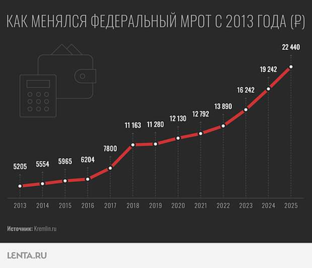 Федеральный МРОТ устанавливает правительство РФ одновременно на всей территории страны. До конца 2025 года МРОТ равен 22 440 рублей, в 2026-м показатель увеличится почти на 21 процент, то есть на 4653 рубля.
