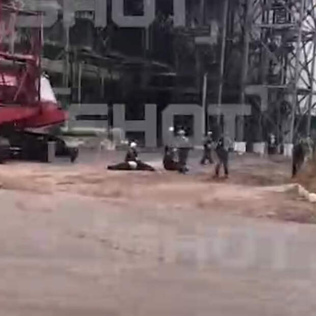 На кадрах видно, как мужчина в противогазе стоит среди заводских установок. Вокруг него белые облака дыма. Потерпевшие лежат прямо на асфальте.