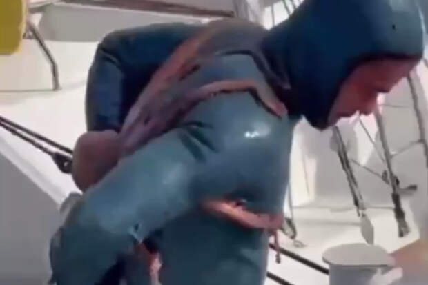 Мужчина просто чистил дно яхты, когда моллюск приклеился к спине и не хотел оставлять свою «жертву». Очевидцы схватки не знали как помочь дайверу, а он в свою очередь просил нож, видимо, чтобы поскорее освободиться от хватких щупальцев осьминога.