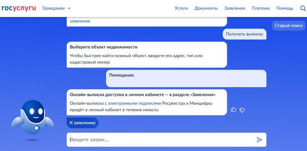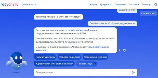 «Это достаточно новая услуга и очень удобная, — пояснил руководитель группы «Юридическая помощь онлайн» Александр Бударагин. — Авторизовавшись на сайте "Госуслуги", введите в поле для запроса "выписка из ЕГРН". Дальше можно либо ответить на несколько вопросов робота-помощника Макса, который работает на сайте, либо заполнить форму самому. После отправки запроса выписка появится в личном кабинете в течение одной минуты».