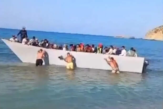 Инцидент произошел на пляже Саракинико острова Гавдос в Греции. На кадрах видно, как лодка, переполненная мигрантами, приближается к берегу. Это замечают трое мужчин у моря.