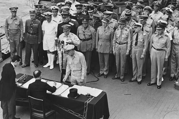 2 сентября (3 сентября по московскому времени) на борту американского линкора «Миссури» министр иностранных дел Японии Мамору Сигэмицу подписал Акт о безоговорочной капитуляции.
