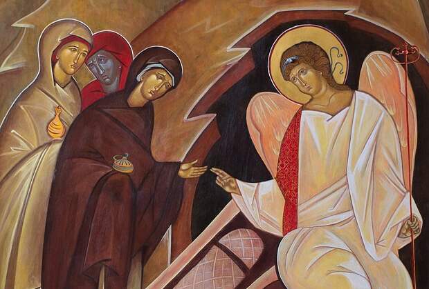 Когда они пришли ко гробу, то обнаружили, что камень отвален, а тело исчезло. Встревоженные, они встретили ангела, который возвестил им: «Что вы ищете Живого среди мертвых? Его нет здесь — Он воскрес!