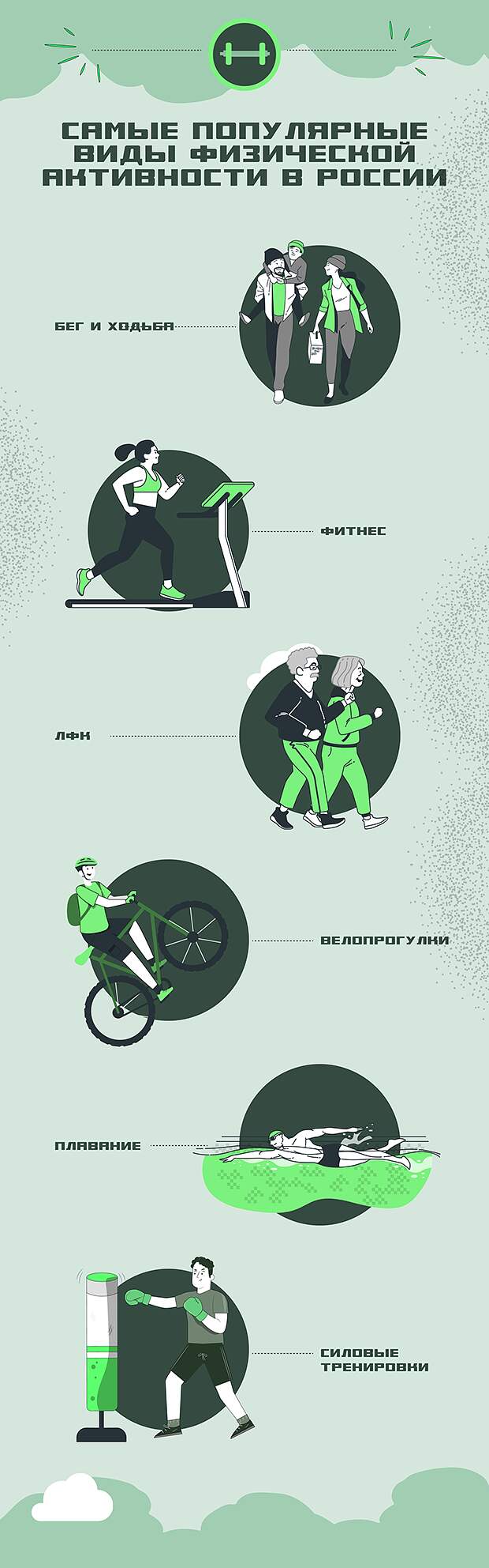 Опрос ВЦИОМ показал, что чаще всего россияне занимаются спортом, чтобы поддерживать организм в тонусе. Поэтому наиболее выигрышными видами физнагрузки остаются самые простые занятия, не требующие дополнительной подготовки или оборудования — бег и фитнес. Подробнее о беговых клубах можно узнать на Сберегаем вместе.