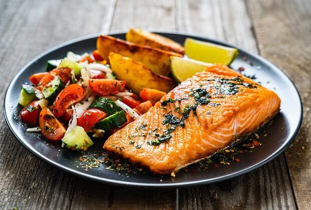 - рыба и морепродукты: в умеренных количествах, предпочтительно нежирные виды, такие как лосось или сардины;